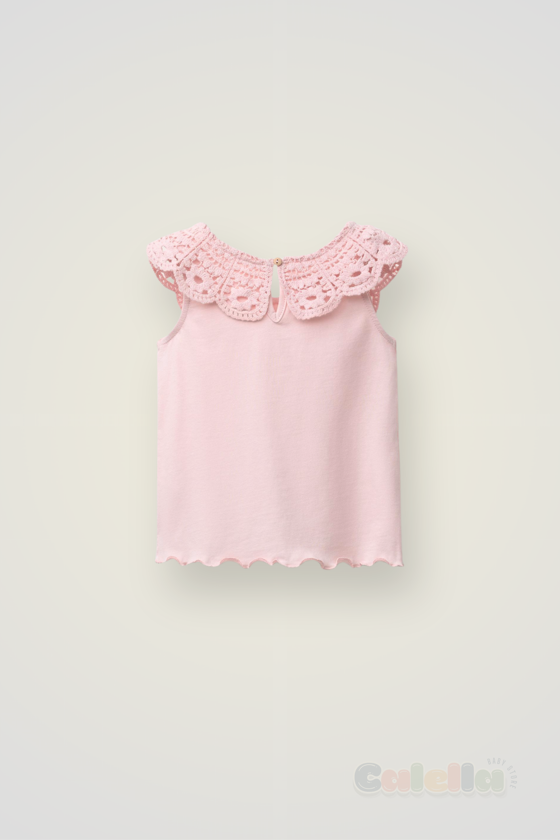Esta blusa encantadora presenta un cuello redondo con un delicado aplique de volante en punto crochet y manga sisa, perfecta para un look fresco y divertido. Su cierre con botón tipo lágrima en la espalda añade un toque coqueto, mientras que el detalle en el bajo acabado en rizo aporta suavidad y estilo. Confeccionada en 100% algodón, garantiza comodidad y frescura durante todo el día. ¡Ideal para quienes buscan combinar comodidad con un toque juguetón!