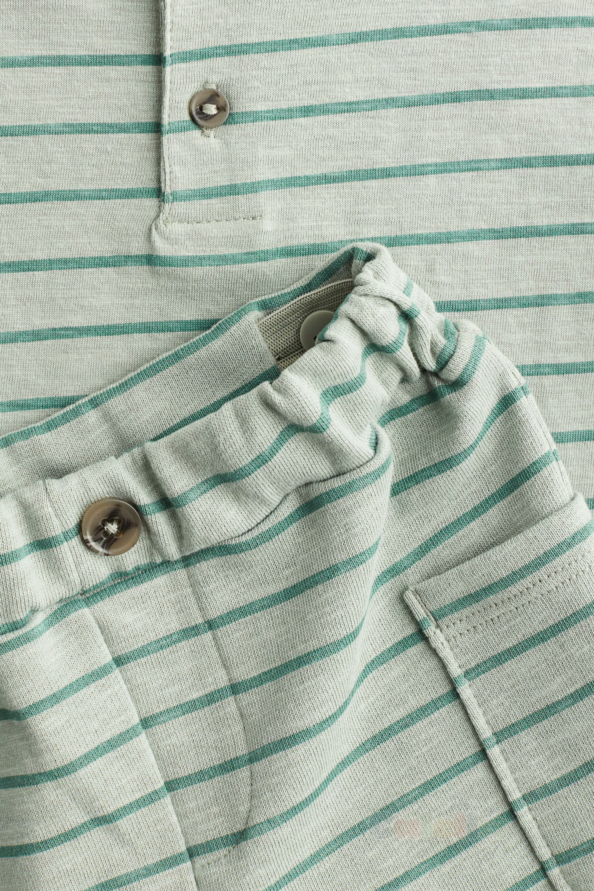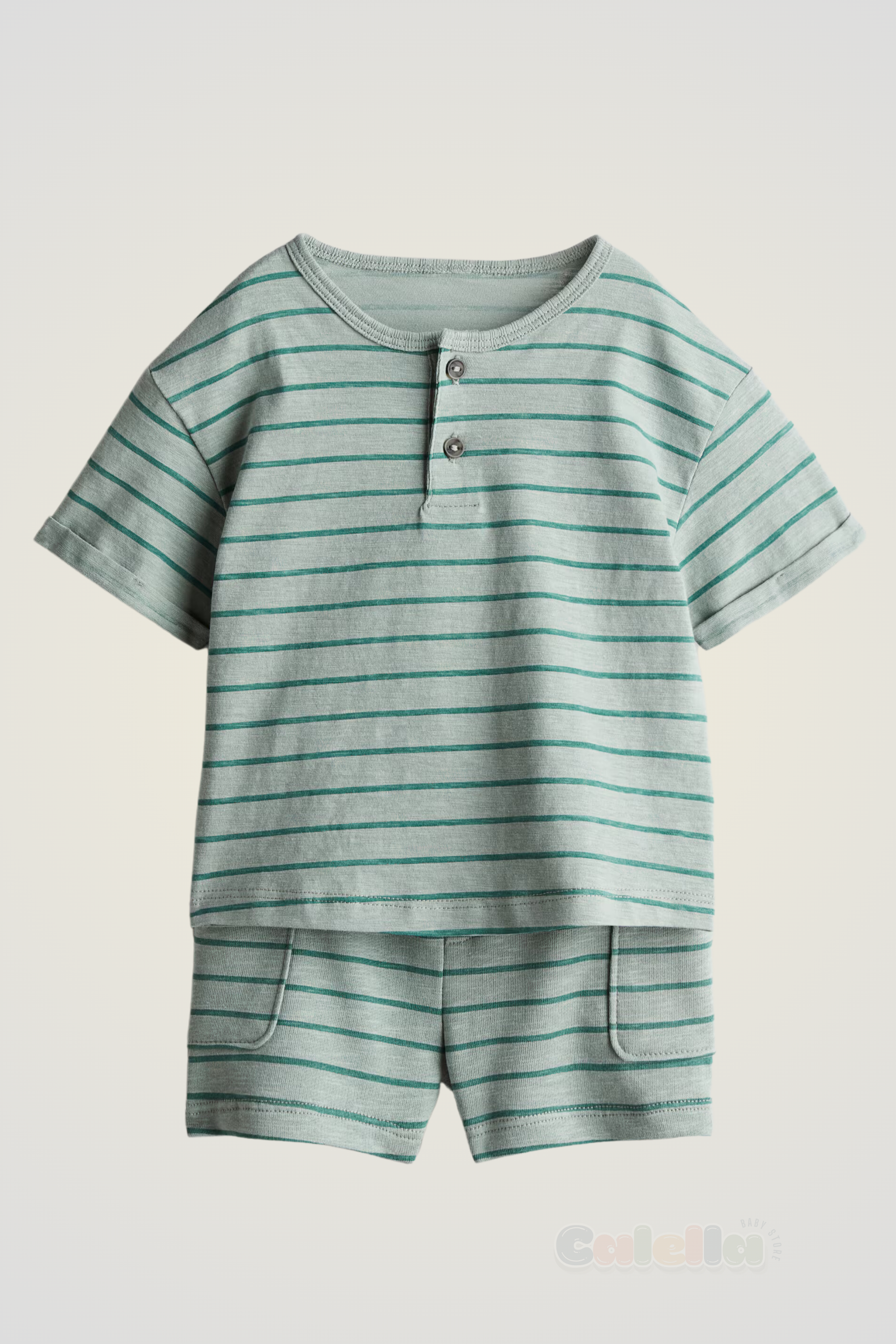 Este conjunto de dos piezas en tela suave de algodón es perfecto para los niños. La franela de hombros caídos y cuello redondo cuenta con botones de imitación de madera y mangas cortas con vuelta cosida. Mientras tanto, el pantalón corto presenta una cinturilla elástica ajustable y cierre decorativo con botón, además de bolsillos abiertos en las piernas para mayor comodidad. ¡Un conjunto cómodo y moderno para tus pequeños!