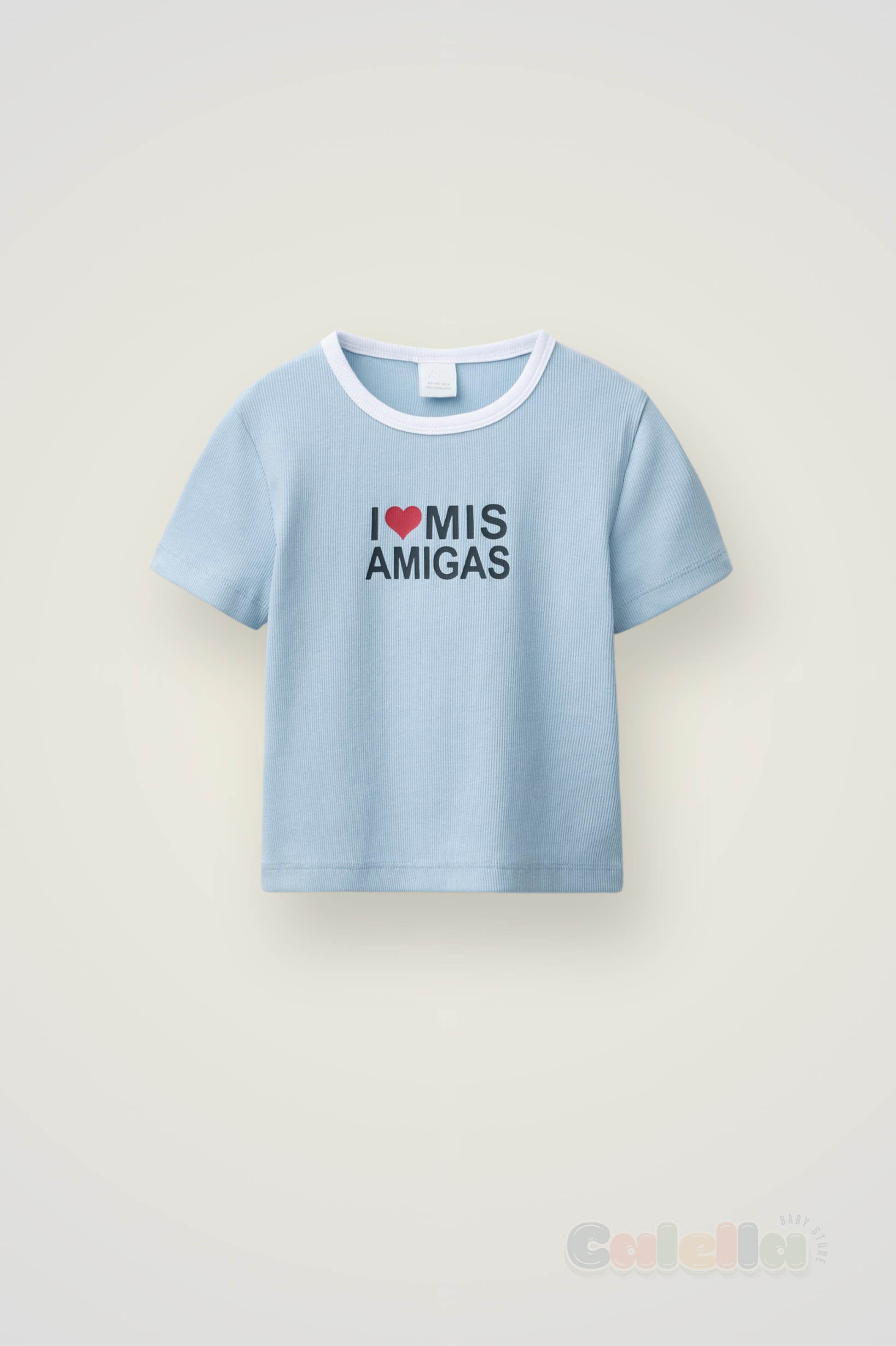 Esta camiseta rib de manga corta y cuello redondo combina comodidad y estilo con su tejido suave de 96% algodón. El detalle en contraste añade un toque divertido, mientras que el estampado de texto en el delantero le da personalidad única. Perfecta para un look casual y lleno de energía.
